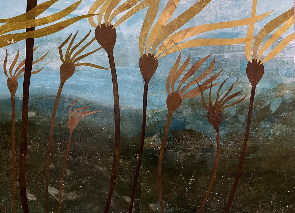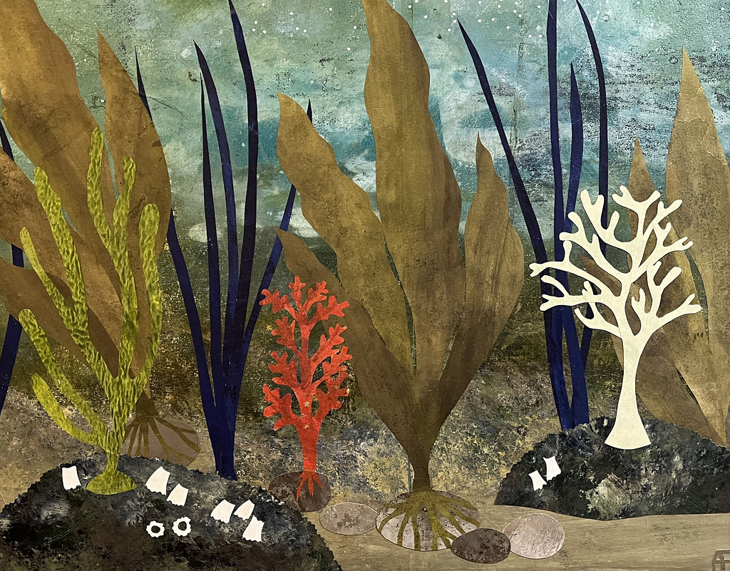 Amy paints or prints her backgrounds and then applies handmade paper, hand painted paper, purchased papers and maps to create unique and playful worlds.Influenced by the art of Henri Rousseau and Rex Ray, she creates unique garden scenes, landscape and under-seascapes.