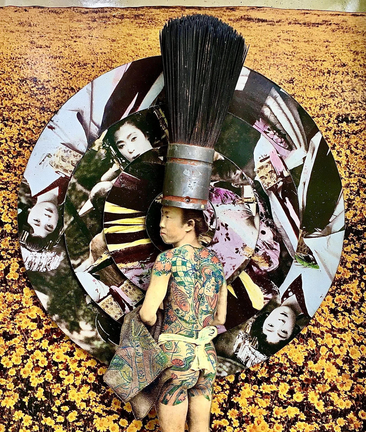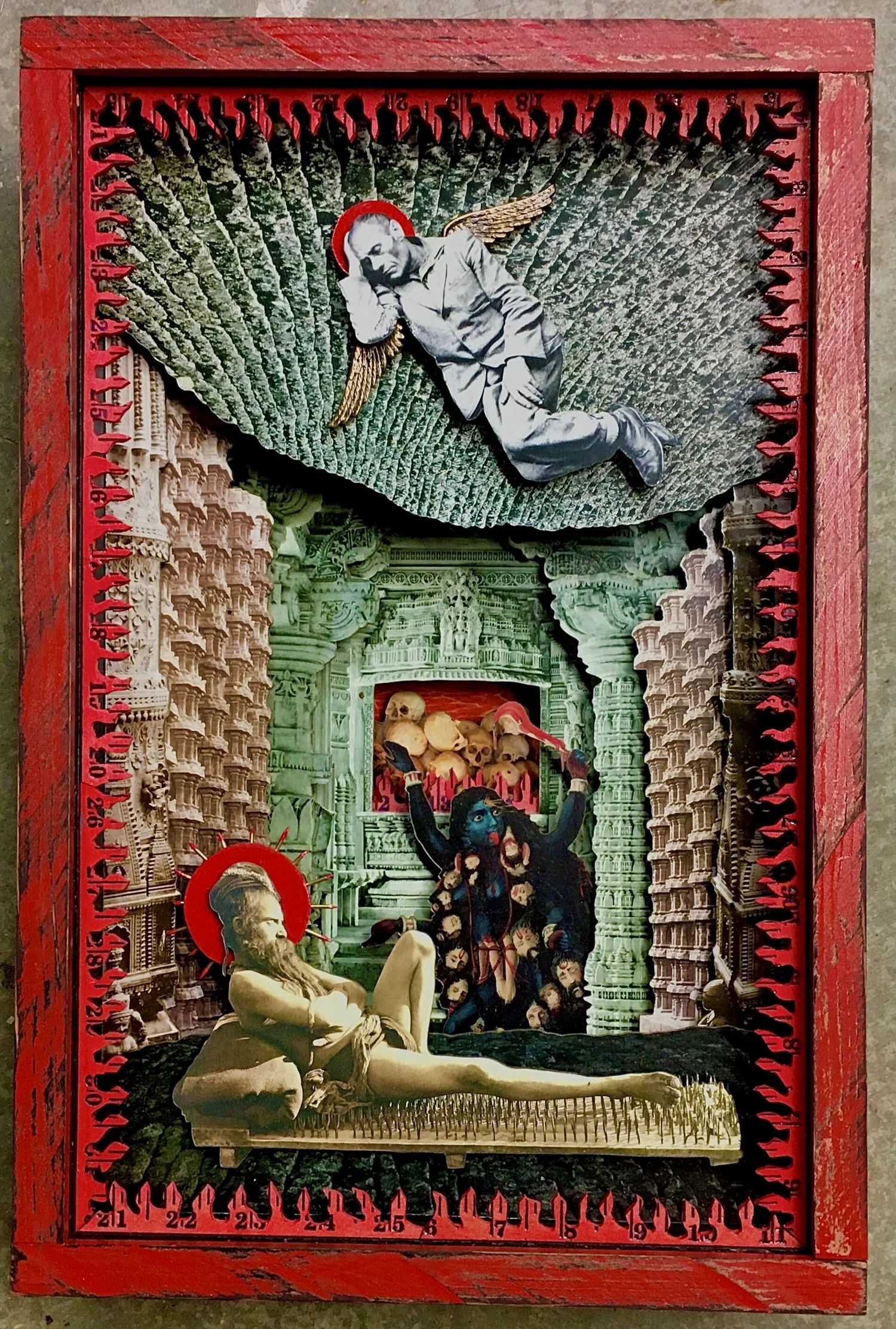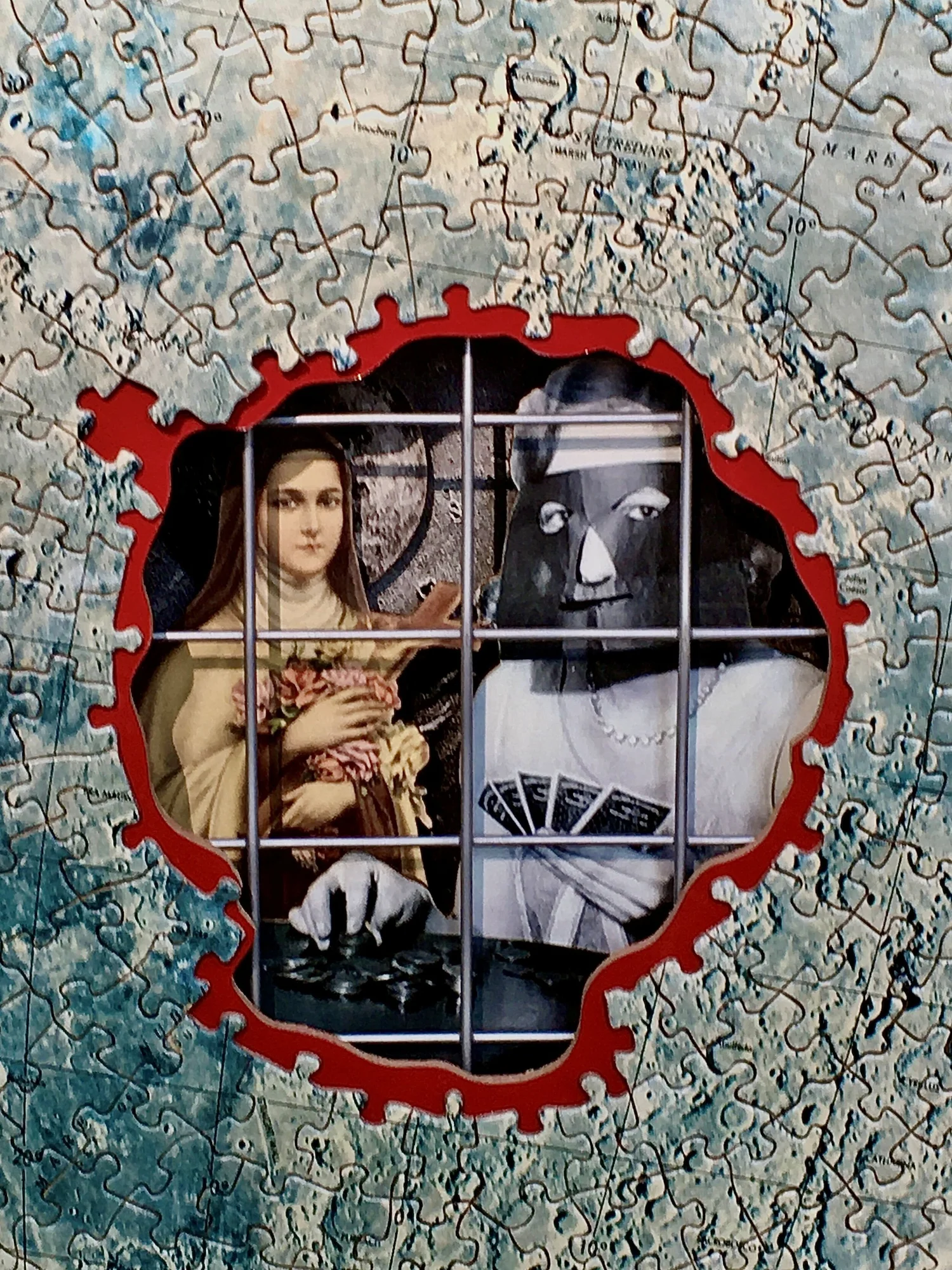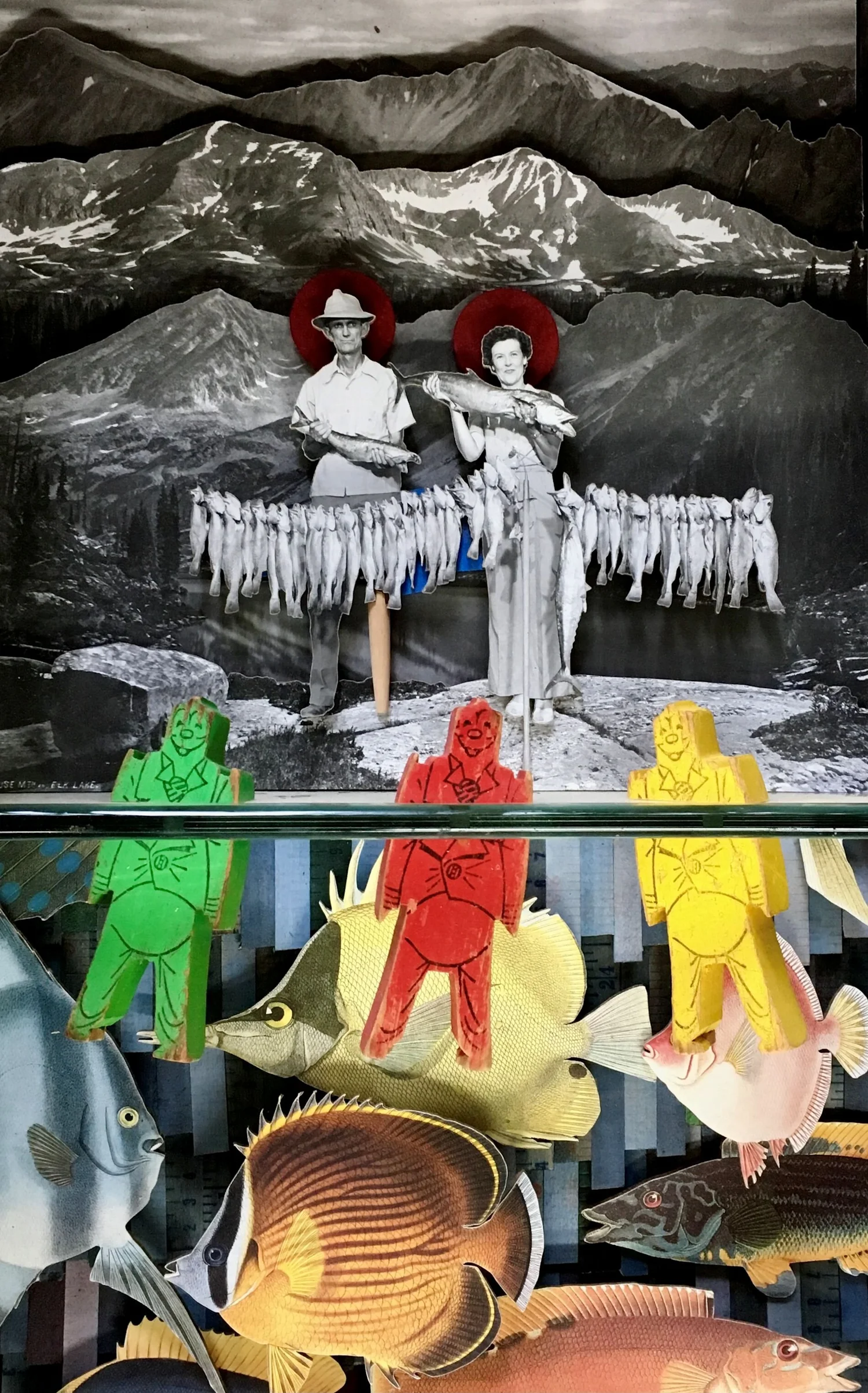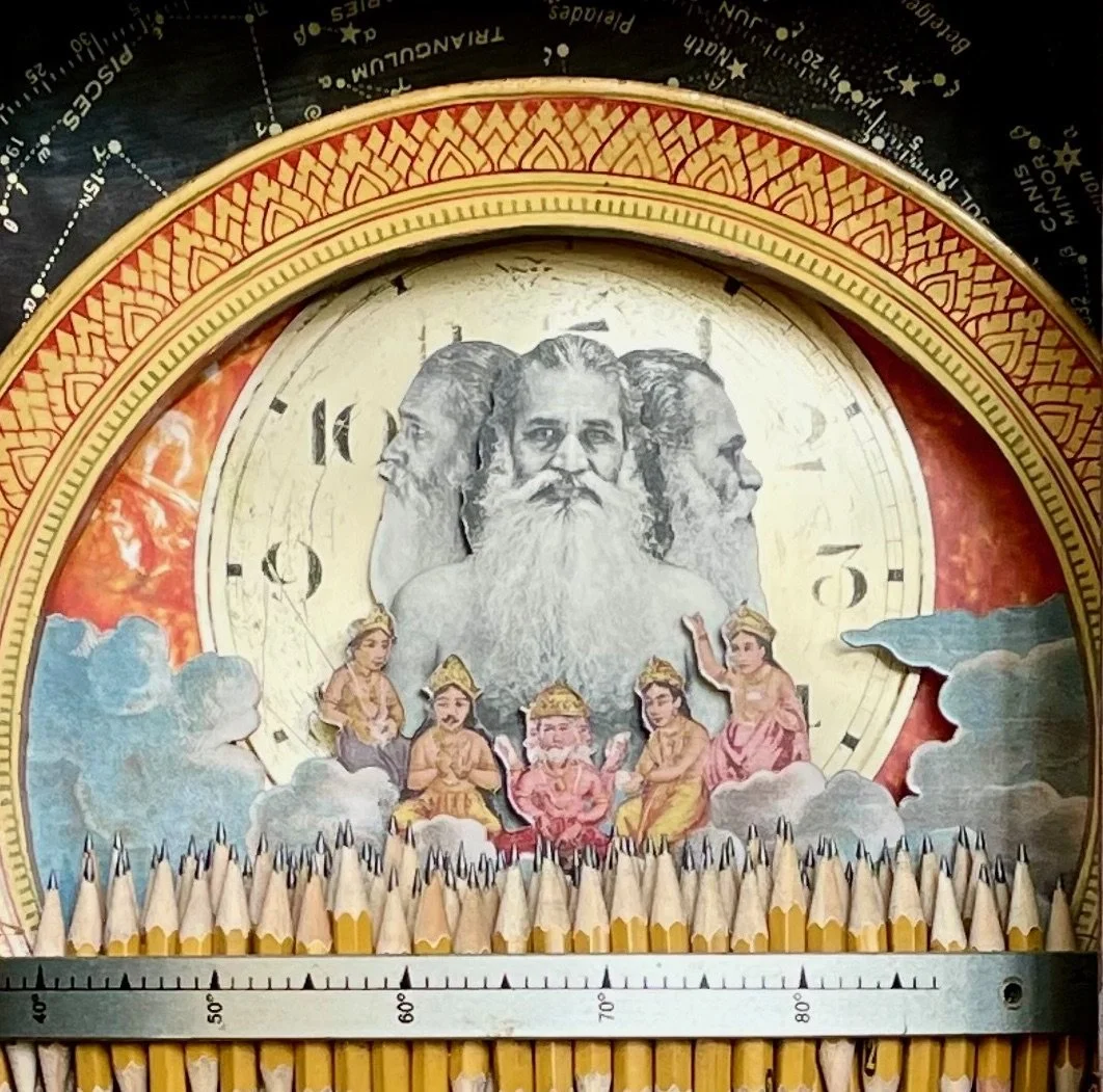 The best way to describe my medium is a 3-D collage diorama. Most pieces have a narrative theme and can be quirky in their message. I use found objects along with photographs mounted to masonite and cut to form. The pieces are then mounted into boxes, clock cases, cigar boxes to create scenes that evoke memories, experiences, and /or history to foster an examination of self and society. I also make cigar box ukuleles.