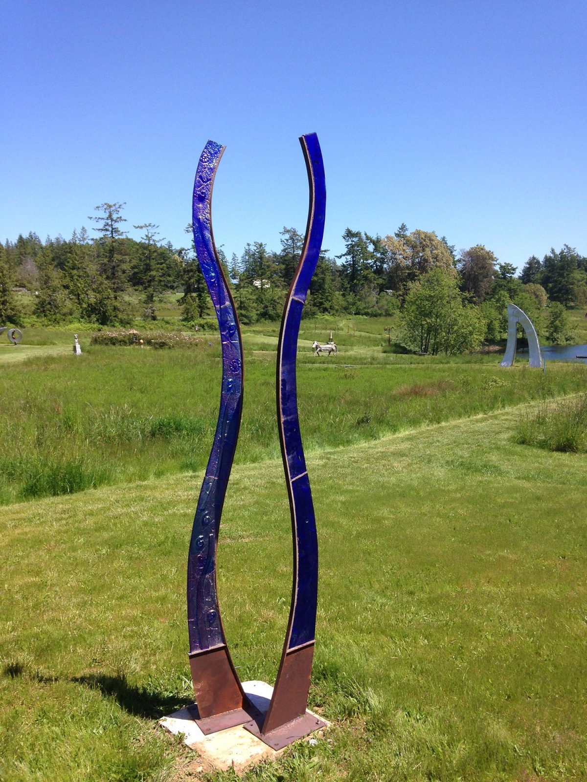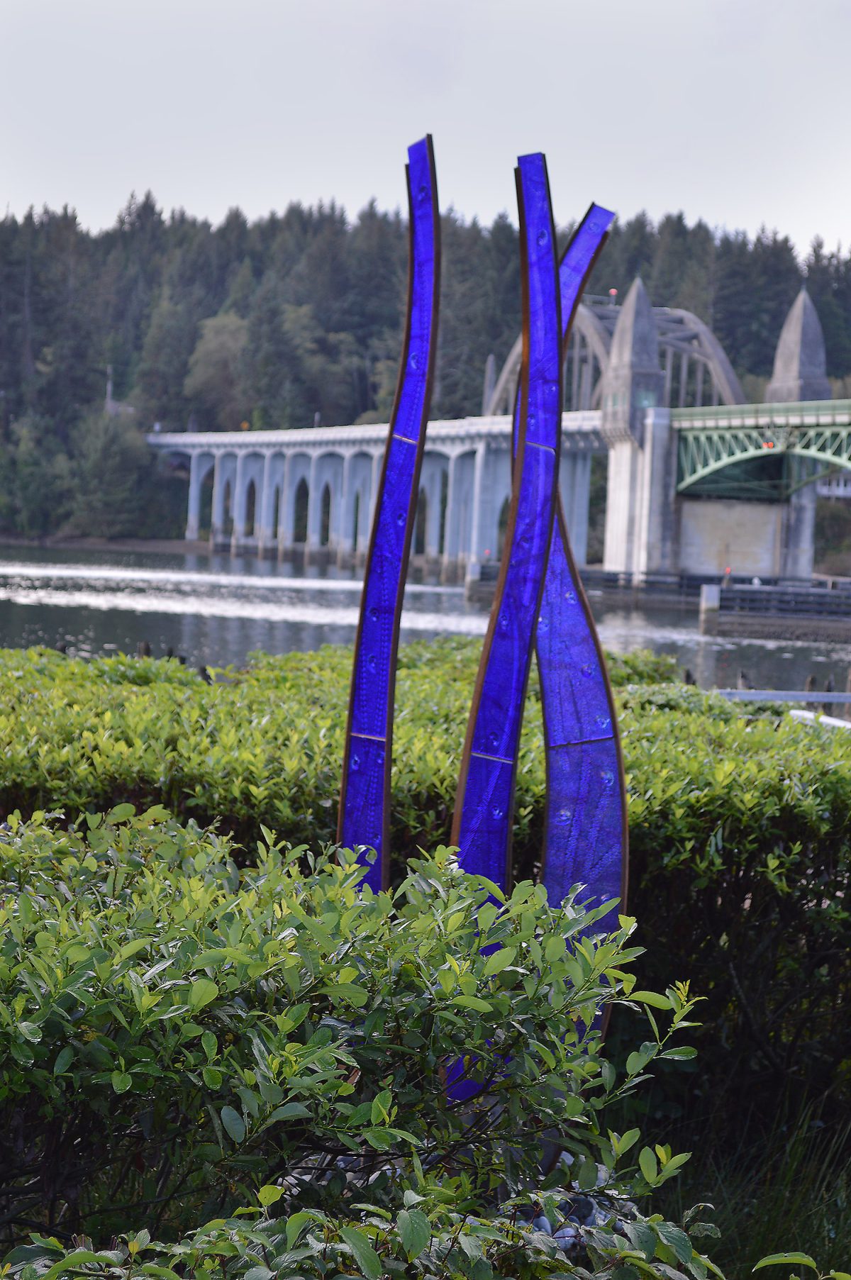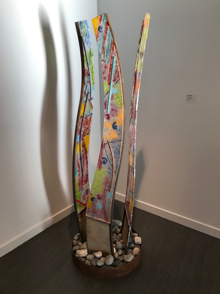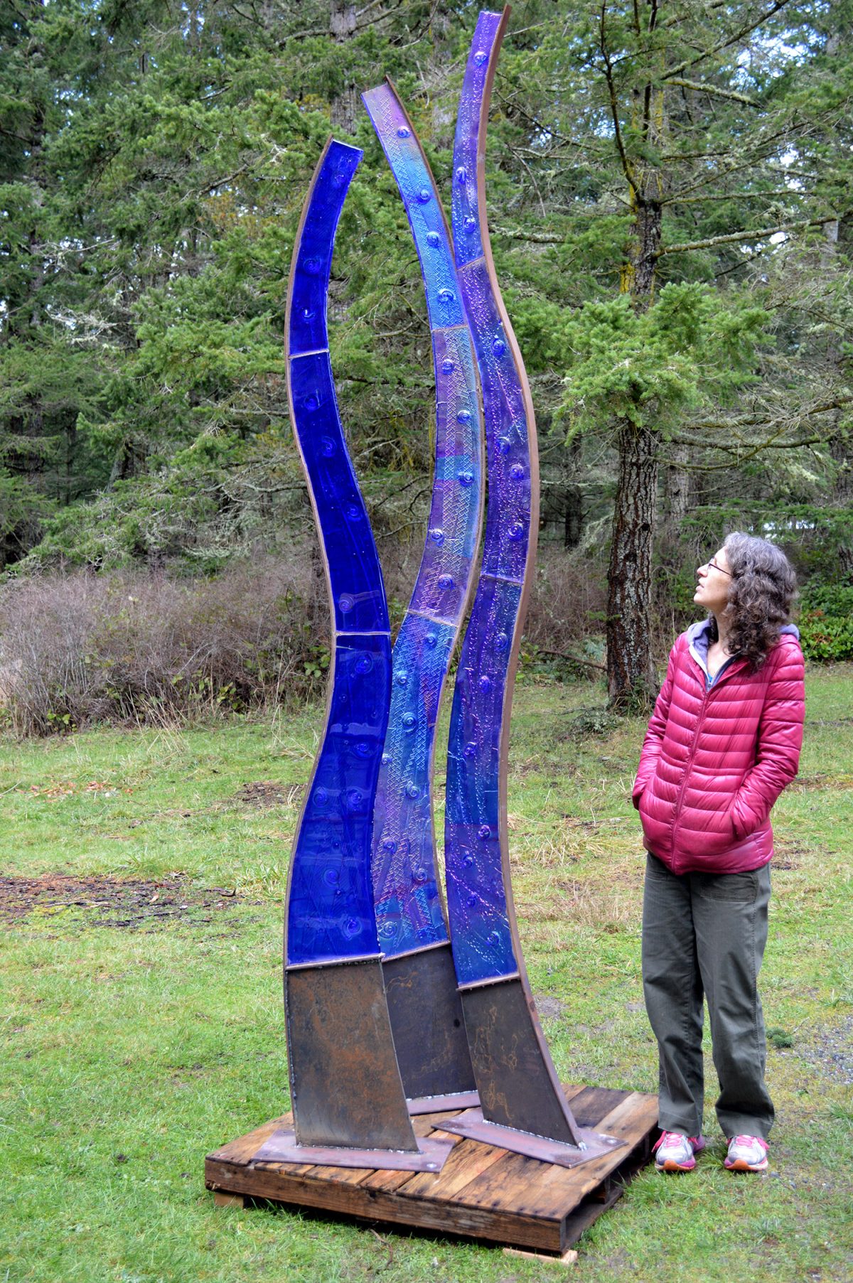 Gerry Newcomb works with kiln cast glass, forming large architectural panels, wall murals, sculptures, light fixtures and tables. These pieces invite people to explore them from many perspectives, with both their eyes and their hands. They play with light to produce colors and shapes and they speak to the forms around us.