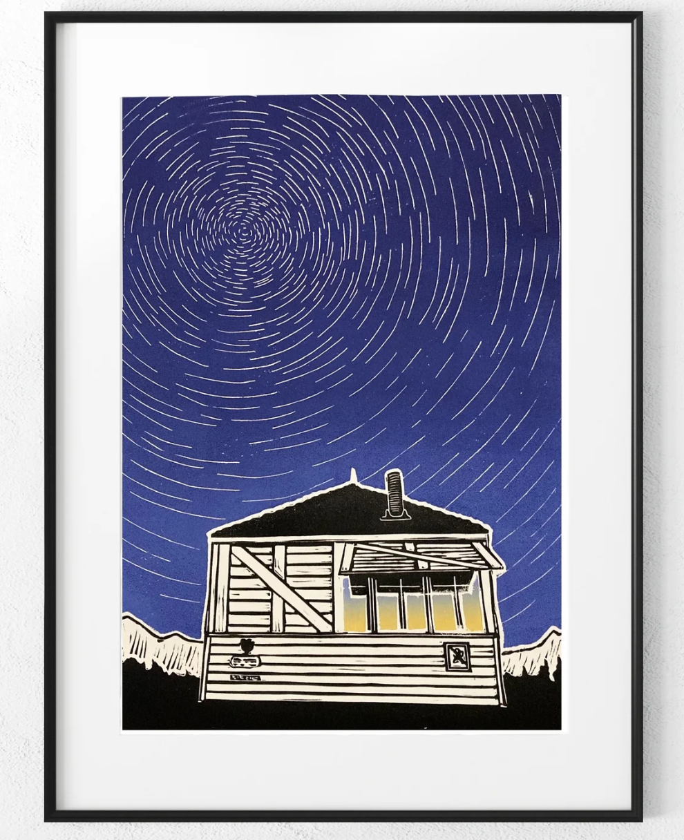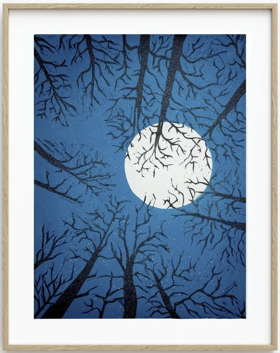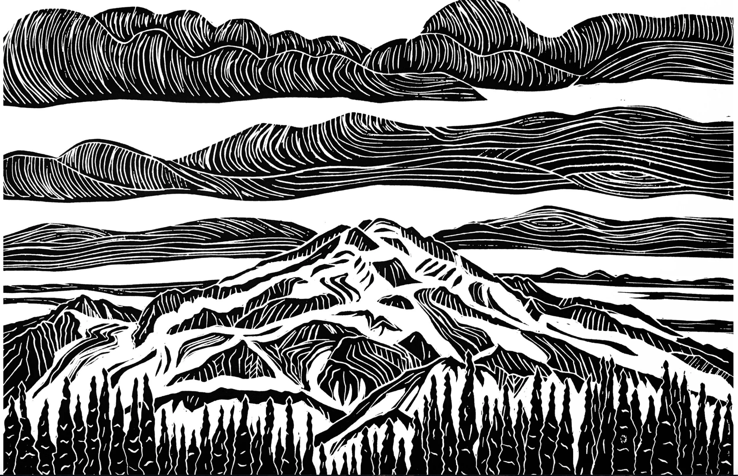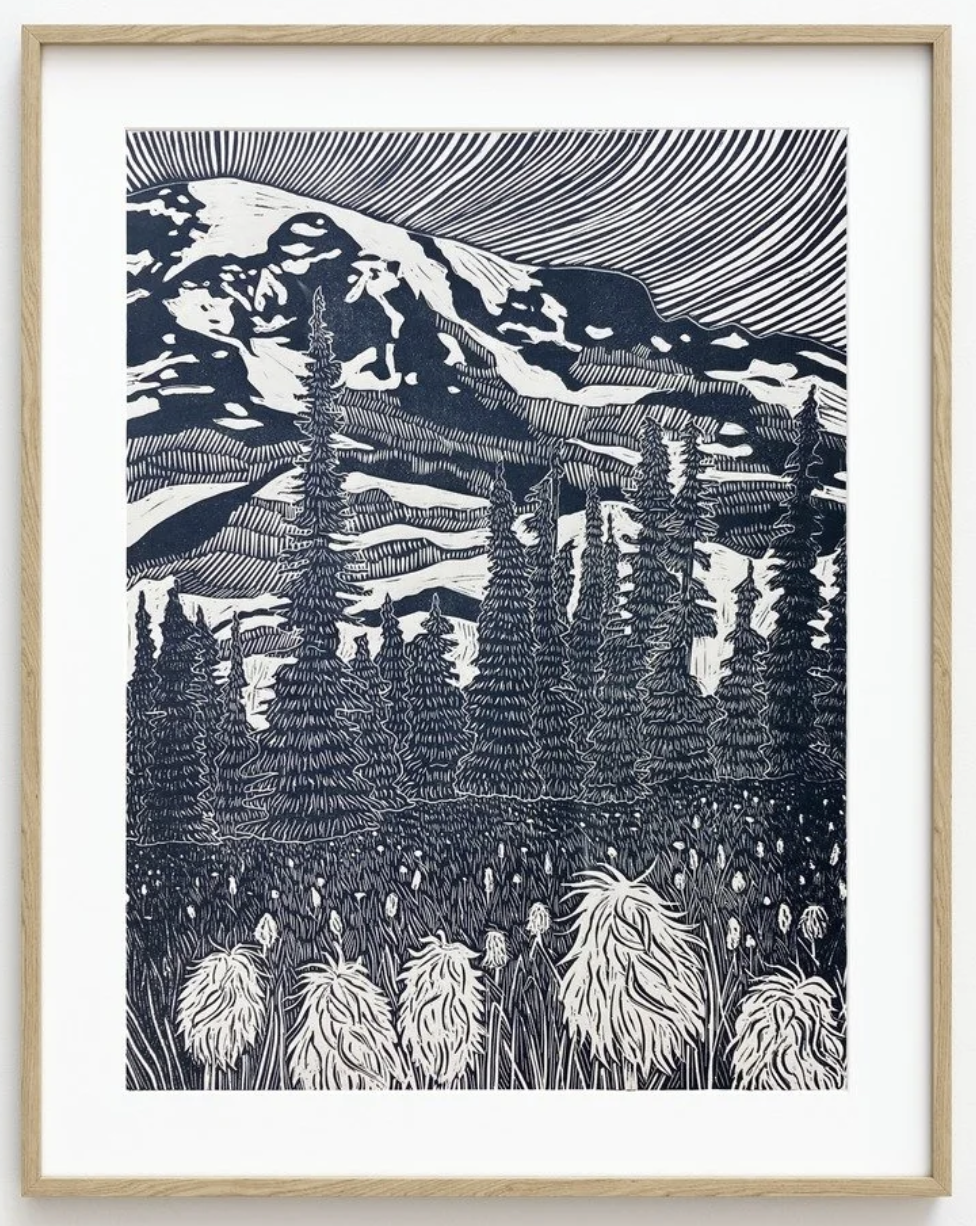 Hannah Lunstrum is a linocut printing artist, based on Orcas Island who has carved many incredible prints portraying the beauty of our forests in the San Juan Islands, broad landscapes and horizons, and awe-inspiring reflections of human life. She prints with nothing black & white and color ink.