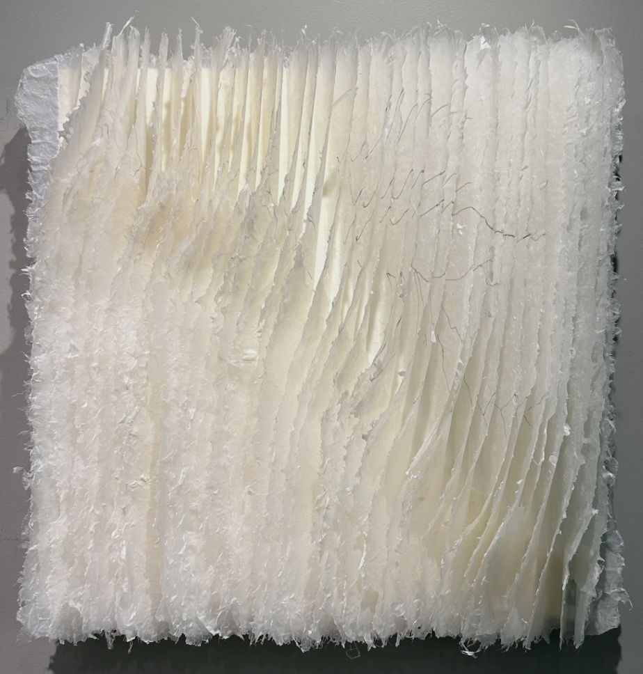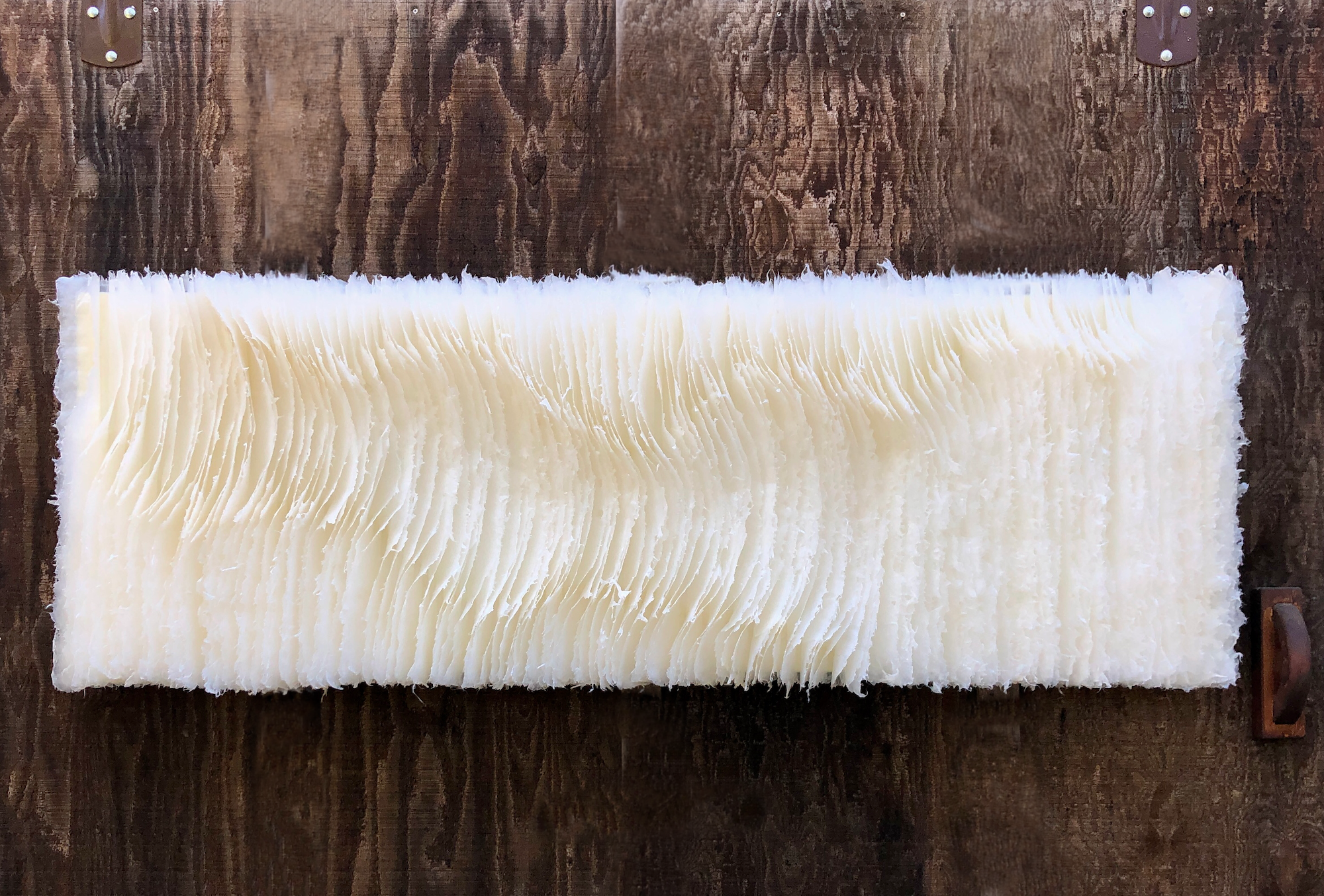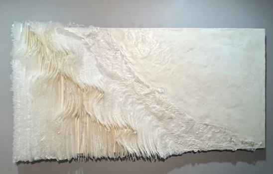 The colors one perceives in each piece are not colors from dye, but the play of light and shadow as one moves position in relation to the artwork. Each work is comprised of natural elements, including iridescent pigment made from the likes of fish scales and freshwater oyster shells ground into an oil medium to uniquely reflect light, wax from bees, and organic Kozo pulp from Japan to make the translucent paper—a process that takes months to complete.