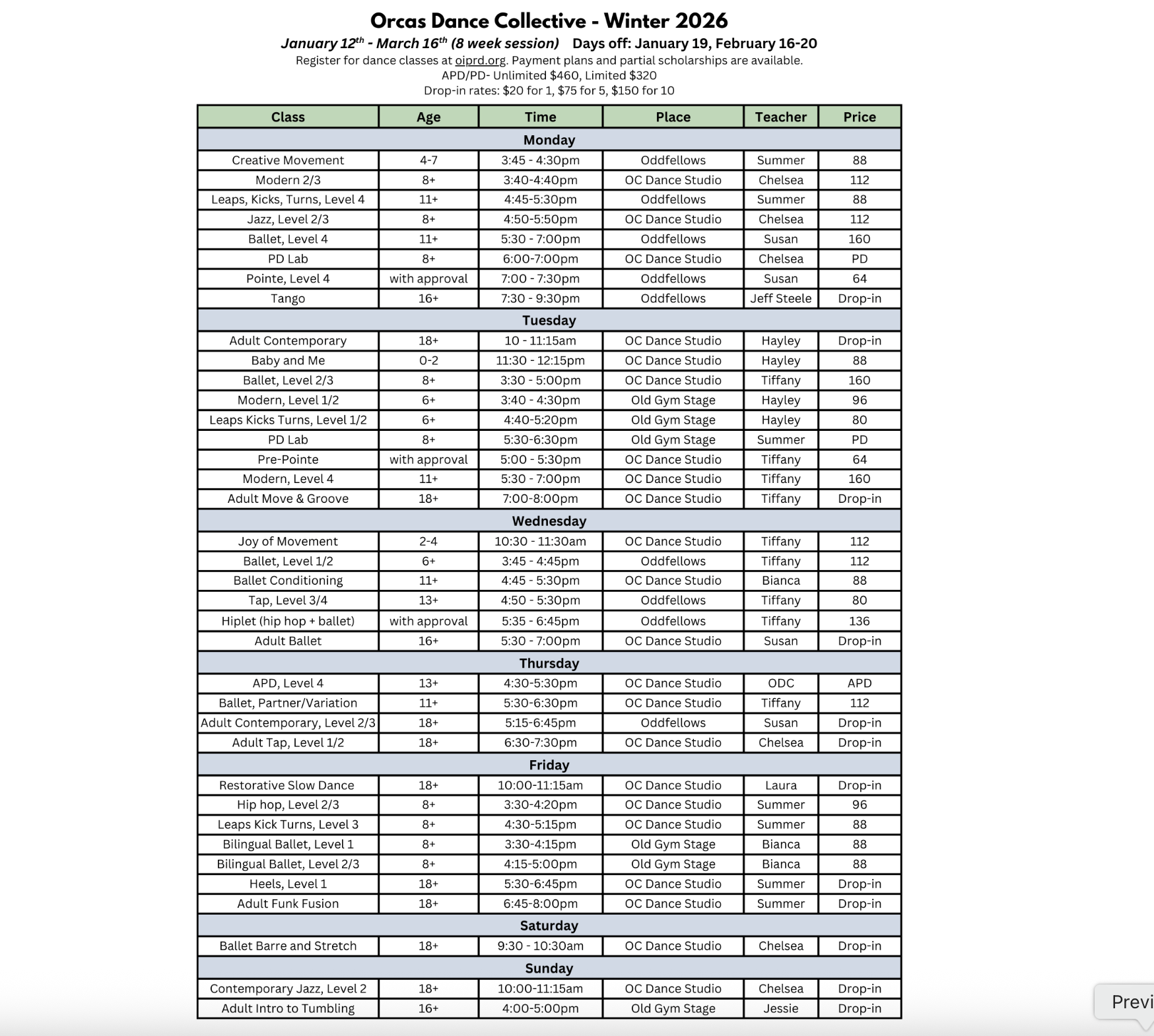 Orcas Island Park and Recreation District (OIPRD) handles the registration and organization of recreational classes all around the island. Sports, dance, yoga, martial arts, etc. classes, programs, and services are managed by OIPRD.