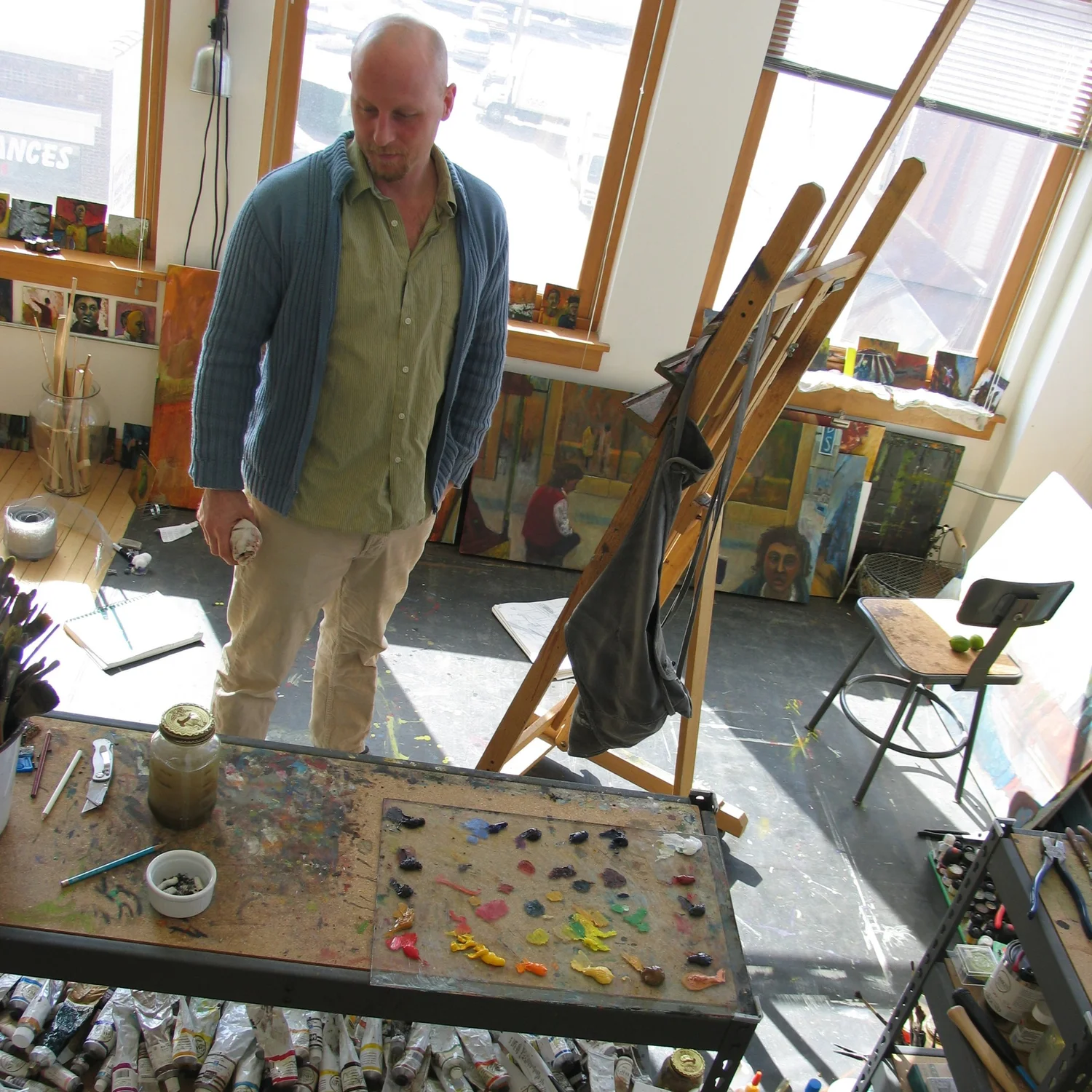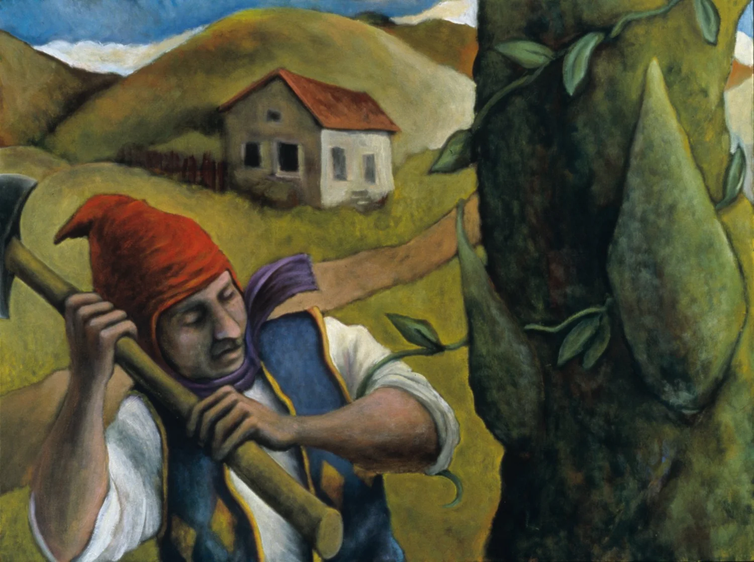 “I grew up on an island in SE Alaska with people who made their livings on fishing boats and in sawmills. They were people who had moved to the edge of the earth—a landscape battered by storms, carpeted with moss—and lived bound together by the stories they told. I grew up listening to those stories. Stories about how to get along in that isolated, unforgiving landscape, how to build something, how to get drunk without falling down; about where to find what you’re looking for, about the war and who was there, what we know about it now. Stories about your family, about the people you never knew. Stories about the last time someone tried this or that and how it prospered or failed. I believe that our stories are the most important thing we have to offer each other. This is what I paint. The people in my paintings aren’t aware that they are the center of their own stories. They are busy with their lives, getting to work, talking to the woman behind the cash register, and chopping down the enormous beanstalk. Mostly they are living, working, trying to get along.”
