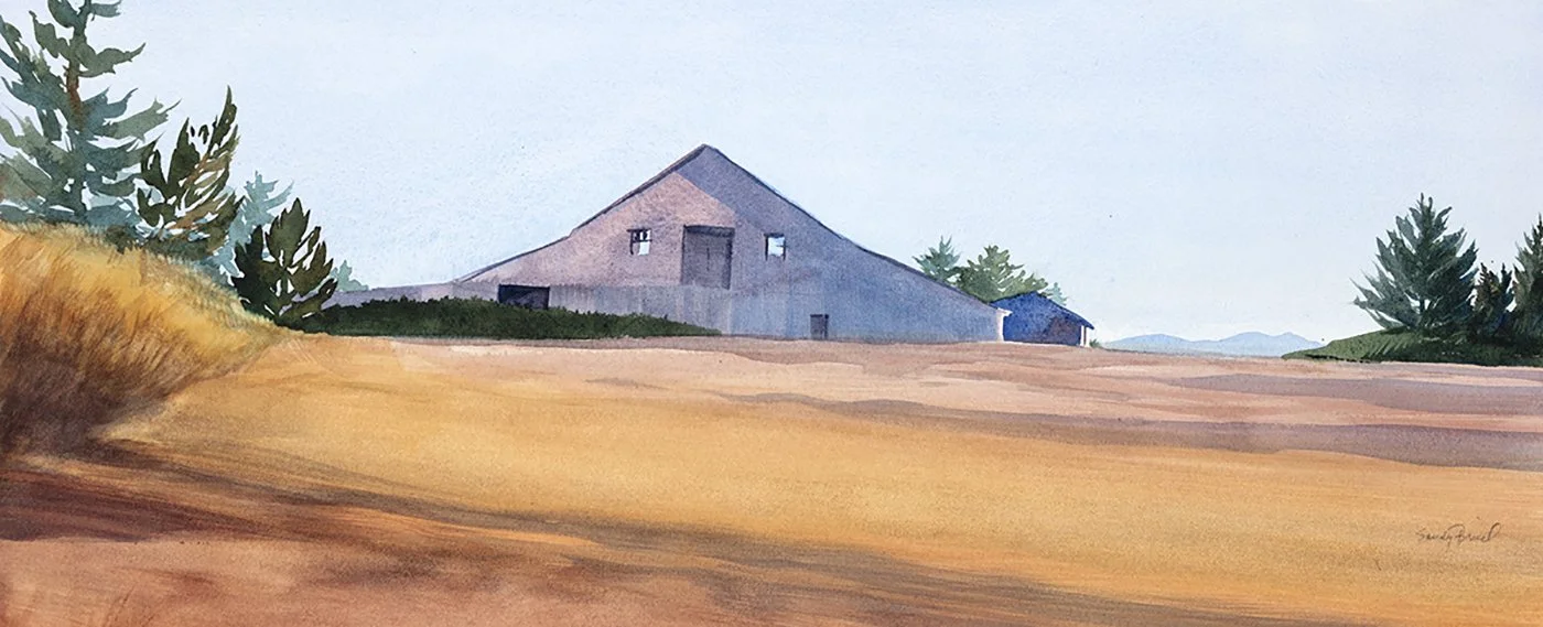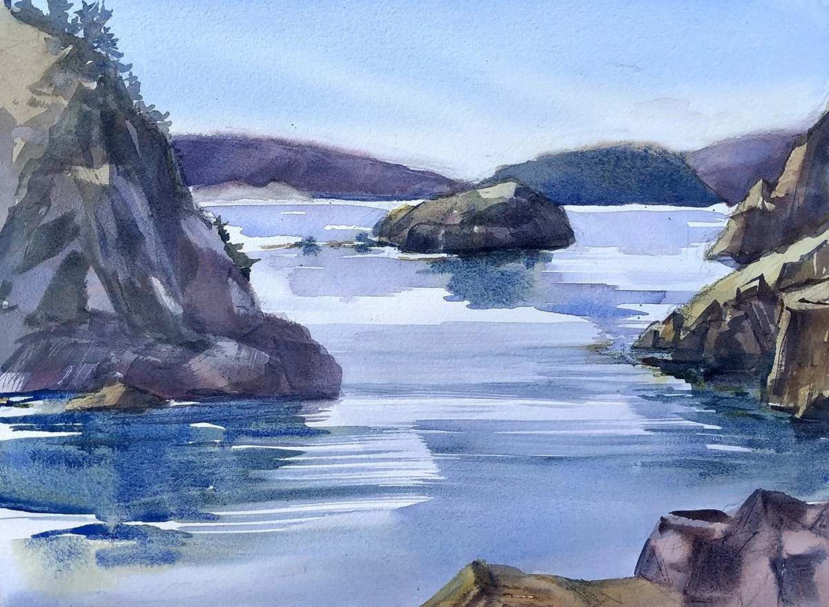 My art illuminates the beauty of the natural world by capturing the light, color and forms through watercolor and printmaking. I gather images and knowledge about my subject through plein air sketching and photography, then develop the painting by building layers of transparent pigments. As a lifelong swimmer and watercolorist, I have always been drawn to water, to the sea and to edges where land meets ocean or stream. I find tremendous inspiration in the diverse life and landforms on Lopez Island, be it the salt marsh, rocky coastline or historical barns.
